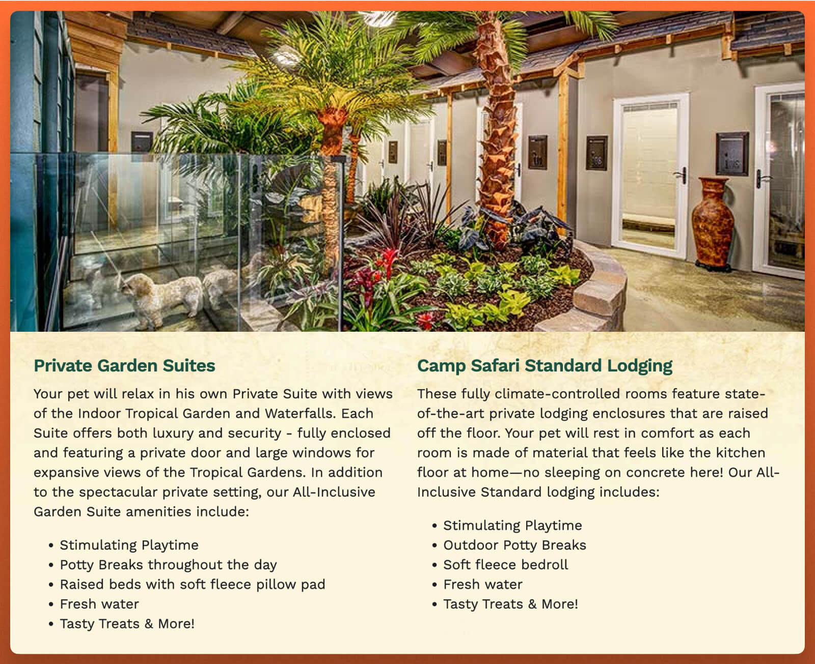 Your offering starts with the rooms that you have available. If you have multiple room types like Safari Pet Resorts, you naturally have a distinction between each offer. For example, the Private Garden Suites at Safari Pet Resort have an additional patio with garden views.